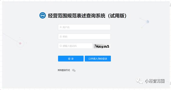 二、使用說明。1.打開經(jīng)營范圍規(guī)范表述查詢系統(tǒng),如下圖1:可使用用戶名、密碼及驗證碼登錄軟件(用戶名:111,密碼:123456);也可點擊“以申請人身份登錄”直接進(jìn)入軟件。