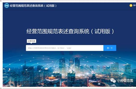 2.進(jìn)入系統(tǒng)后,可在中央白色搜索框中輸入要搜索的經(jīng)營范圍或相關(guān)關(guān)鍵字,點擊“查一下”按鈕,如下圖2: