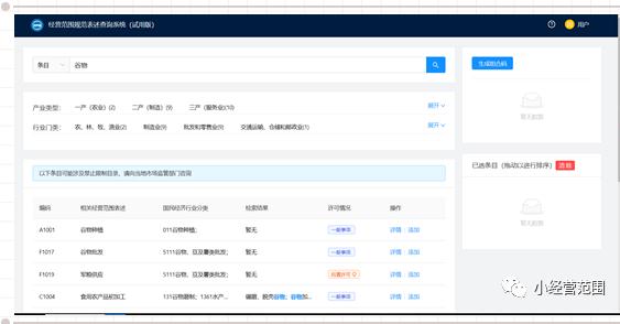 (7)檢索結(jié)果:搜索關(guān)鍵字在經(jīng)營范圍規(guī)范表述中的檢索結(jié)果。