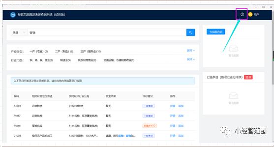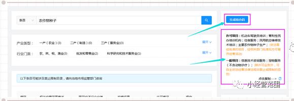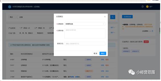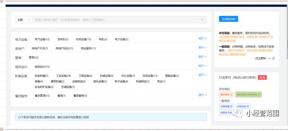 (1)  經(jīng)營范圍搜索區(qū)域:可通過搜索關(guān)鍵字,點擊查詢按鈕進(jìn)行查詢。搜索區(qū)域下有產(chǎn)業(yè)類型和行業(yè)門類兩項,可通過點擊相對應(yīng)的產(chǎn)業(yè)類型和行業(yè)門類對搜索結(jié)果進(jìn)行篩選。