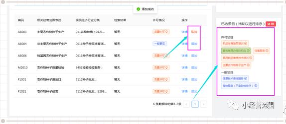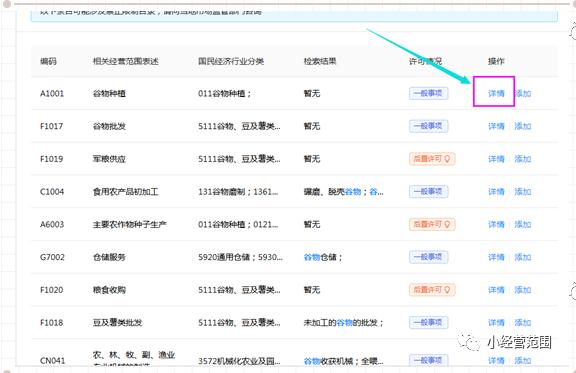 (3)  經(jīng)營范圍查詢結(jié)果顯示區(qū):第一是經(jīng)營范圍對應(yīng)唯一編碼;第二是相關(guān)經(jīng)營范圍表述;第三是此經(jīng)營范圍對應(yīng)的國民經(jīng)濟(jì)行業(yè)分類;第四是搜索關(guān)鍵字在經(jīng)營范圍規(guī)范表述中中的檢索結(jié)果;第五是許可情況,直接顯示該項經(jīng)營范圍規(guī)范是否許可,分為前置許可、后置許可及一般事項;第六是操作按鈕,可點擊此項按鈕進(jìn)行詳情查看,見下圖6: