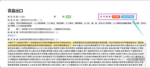 (4)許可情況:分為許可事項、一般事項及自貿(mào)區(qū)改為備案。許可事項指的是根據(jù)該條經(jīng)營范圍表述條目指代的活動是涉企許可事項,需經(jīng)相關(guān)行業(yè)主管部門批準(zhǔn)方可開展經(jīng)營活動;一般事項可持營業(yè)執(zhí)照直接開展經(jīng)營活動。自貿(mào)區(qū)改為備案指的是國務(wù)院在自由貿(mào)易試驗區(qū)暫時調(diào)整實施相關(guān)法律法規(guī)規(guī)定的,依法開展經(jīng)營活動。見圖8: